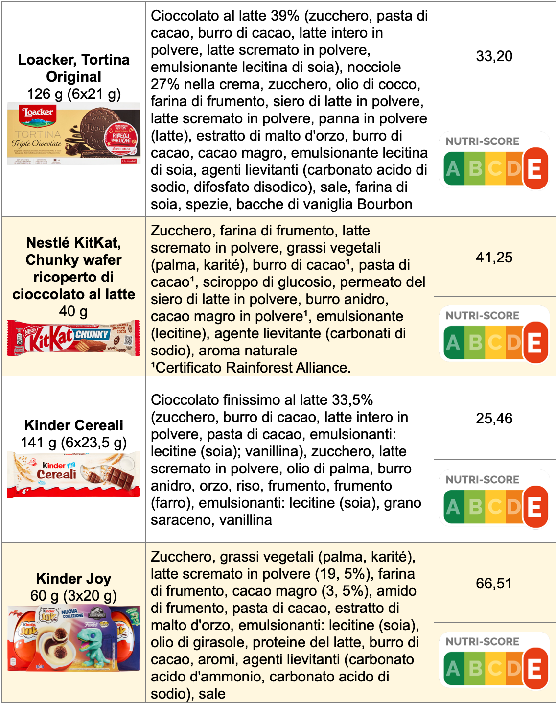 I prezzi aumentano quando consideriamo snack al cioccolato, come wafer e barrette, pensati prevalentemente per i bambini. Per la Tortina Original Loacker a base di wafer con crema di nocciole, ricoperto di cioccolato al latte, in confezione da 6 pezzi, si spendono circa 33 €/kg. Per l’eccesso di grassi e di zuccheri la classe Nutri-Score è la ‘E’. Il KitKat Chunky Wafer ricoperto di cioccolato al latte, a marchio Nestlé, costa 41 €/kg e il punteggio anche in questo caso è una ‘E’.