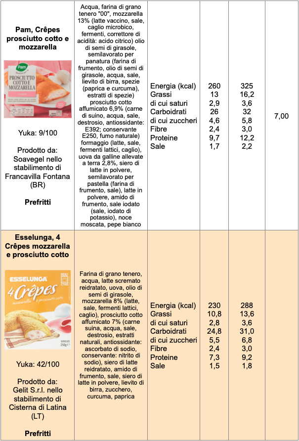 Se facciamo la scansione di questi prodotti con l’app Yuka, che tiene conto sia degli aspetti nutrizionali che degli additivi, il punteggio va da 9/100 a 72/100, il punteggio minimo viene assegnato ai prodotti più ricchi di sale e di additivi (come i nitriti o il difosfato disodico).