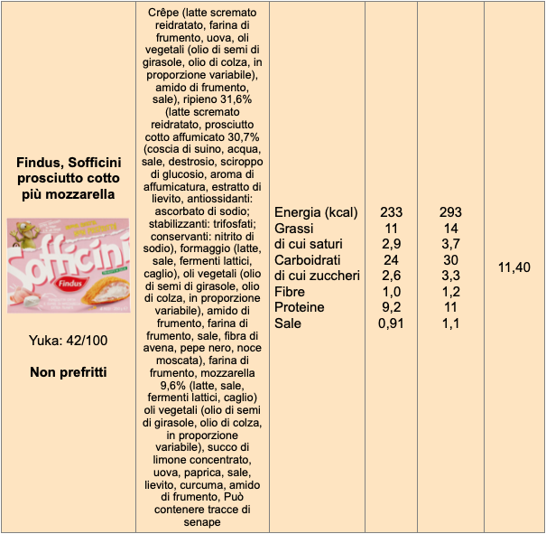 Quanto ai sofficini, sono prodotti ultratrasformati e come tali da evitare per quanto possibile, sono tutt’altro che salutari non solo per il sale (per il quale basta ridurre la dose in altre pietanze per non sforare la dose superprudenziale di 5 grammi/die), ma per la congerie di ingredienti (nei Sofficini Findus ce ne sono oltre 20 ) usati per realizzare un pomodoro-mozzarella impanato e fritto, che in casa ne richiede 6 (contando pomodoro, mozzarella, uovo, pangrattato, sale, olio per la frittura).
