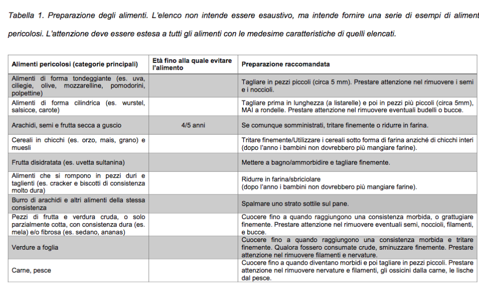 Gli alimenti “pericolosi” sono quelli con particolari forme, dimensioni e consistenza che però possono essere resi “innocui” con piccoli accorgimenti. Il primo gruppo comprende quelli troppo piccoli (semi e arachidi) o troppo grandi (pezzi di carne, frutta, verdura cruda). Ci sono poi gli alimenti molli o scivolosi, dalla forma tonda, come uva e ciliegie, oppure cilindrica, come i wurstel (che bisognerebbe dare con attenzione ai bambini, considerato il loro scarso valore nutrizionale), la mozzarella, i pomodorini e le olive, il kiwi. Meritano attenzione anche gli alimenti duri o secchi, come verdure crude di consistenza fibrosa (carote, finocchio, sedano), noci e frutta a guscio. Un’ultima nota riguarda il cibo con una consistenza appiccicosa (come il burro di arachidi). Tutti questi prodotti, con meccanismi differenti, possono comportare il rischio di soffocamento.