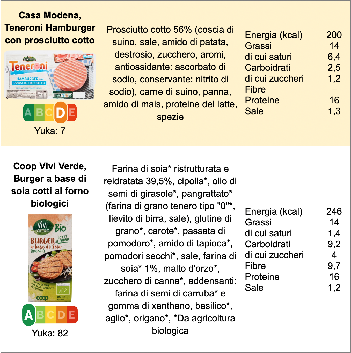 La versione vegetale esce vincente anche dal confronto fra i burger: la percentuale ridotta di grassi saturi e quella elevata di fibre fanno guadagnare una A al burger di soia, mentre il prodotto a base di suino riceve una D. La valutazione dell’app Yuka2 mostra lo stesso andamento, ma risulta più ‘punitiva’ per i prodotti che contengono additivi considerati ‘da evitare’ come il nitrito di sodio e i difosfati-polifosfati.