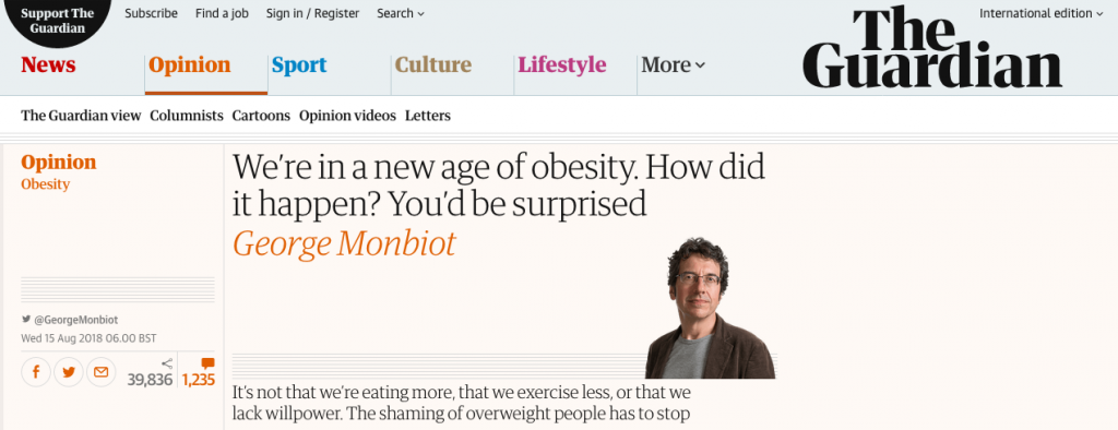 Tutto questo, però, non è avvenuto per caso, osserva l’editorialista del Guardian. L’industria alimentare ha assunto scienziati per rendere i prodotti “irresistibili”. Le agenzie pubblicitarie utilizzano psicologi e neuroscienziati per abbattere le nostre difese. La loro opera sovrasta la forza di volontà, anche se la grande stampa incolpa le singole persone di non saper resistere alla tentazione del cibo, mentre non addebita alcuna responsabilità alle aziende, ai politici e ai lobbisti. Se tutto si riducesse alla responsabilità personale, osserva Monbiot, si dovrebbe identificare un fattore che ha fatto cambiare radicalmente i cervelli di gran parte della popolazione negli ultimi 40 anni. Poiché non è stato identificato alcun elemento, la spiegazione più probabile è da individuare in un ambiente “obesogenico” che favorisce l’obesità. Anche per questo bisognerebbe smettere di additare alla riprovazione sociale le persone in sovrappeso.