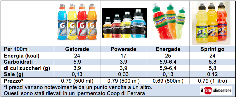 Se consideriamo, nello specifico, alcuni dei più popolari sport drink, vediamo che l’apporto energetico di una bottiglia da mezzo litro va dalle 85 calorie di Powerade alle 125 di Energade. Attenzione però: mentre Energade è dolcificato solamente con “zucchero”, Gatorade contiene anche maltodestrine ed edulcoranti (sucralosio e acesulfame K), e Powerade, oltre agli stessi edulcoranti, contiene destrosio (glucosio) e fruttosio.