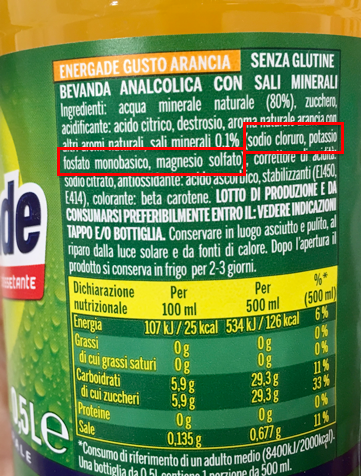 Per quanto riguarda i sali, le liste degli ingredienti di Gatorade e di Energade, comprendono diversi minerali, che nel complesso forniscono sodio, potassio, cloruro e magnesio. Sull’etichetta di Powerade si legge solamente cloruro di sodio (sale da cucina), ma controllando sul sito scopriamo che sono presenti diversi sali a garantire l’apporto di sodio, potassio, cloruro, calcio e magnesio.