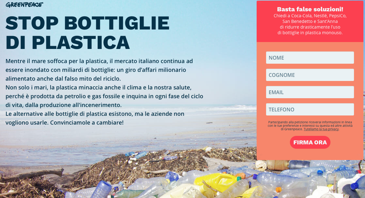 A Coca-Cola, Nestlé, PepsiCo, San Benedetto e Sant’Anna, aziende leader del mercato italiano, Greenpeace chiede di: ridurre drasticamente il ricorso a bottiglie in plastica monouso; di adottare sistemi di vendita basati su un elevato impiego di contenitori riutilizzabili; di lavorare insieme alle grandi catene di supermercati per installare stazioni di ricarica per le bevande. Il mondo delle imprese deve riconoscere una volta per tutte che la plastica monouso ha impatti distruttivi sulle persone e sul Pianeta, e deve impegnarsi ad abbandonarla altrimenti, ben presto non resterà che un mare di plastica! L’estate è un momento in cui si registra il picco di consumo di bottiglie, fermiamolo ora.