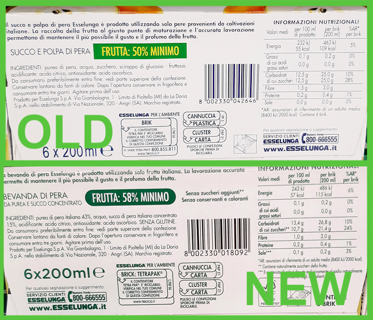 Spesso le ricette dei prodotti in vendita al supermercato vengono modificate per venire incontro alle richieste dei consumatori o alle esigenze di mercato. Pubblichiamo la segnalazione di un nostro lettore riguardo ai succhi di pera Esselunga e la risposta della catena di supermercati.
