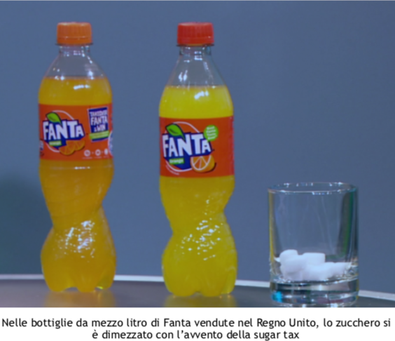 Il 6 aprile 2018 è entrata in vigore la Soft drinks industry levy (Sdil), la tassa “British” sulle bevande analcoliche o poco alcoliche, pronte da bere o solubili che superano una certa soglia di zuccheri aggiunti. I succhi di frutta naturali e le bevande a base di latte sono esenti. Il provvedimento ha coinvolto 326 produttori. La tassa è di 18 pence/litro (0,20 €) per bibite con un contenuto variabile da 5 a 8 grammi di zuccheri per 100 ml, mentre se il contenuto supera gli 8 grammi per 100 ml l’importo sale a 24 pence/l (0,27 €). La tassa britannica è differente rispetto a quelle applicate finora nel resto del mondo, poiché non si pone l’obiettivo di diminuire solo il consumo, ma cerca di spingere i produttori a ridurre il contenuto di zucchero. Nei due anni trascorsi dall’approvazione della legge all’entrata in vigore, oltre il 50% dei produttori ha modificato la ricetta, determinando una riduzione dello zucchero pari a circa 45 milioni di chili per anno. Per rendersi conto del cambiamento, basta confrontare le etichette nutrizionali di alcune bibite vendute sia in Italia sia nel Regno Unito11. Nella maggior parte dei casi, la dose di zucchero risulta dimezzata. Nel Regno Unito la quantità contenuta in Fanta e Schweppes varia da 4,5 a 4,9 g per 100 ml, mentre in Italia oscilla fra 8,9 e 11,8 g. Lo stesso vale per l’aranciata Sanpellegrino, di proprietà di Nestlè: da noi contiene 10,1 g di zucchero, mentre in UK solo 4,7 g. Coca-Cola, invece, ha mantenuto la ricetta originale con 10,6 g per 100 ml. Coca-Cola Zero e Diet Coke non sono coinvolte nella tassa perché usano dolcificanti. Anche Pepsi manterrà la ricetta originale e pagherà la tassa.
