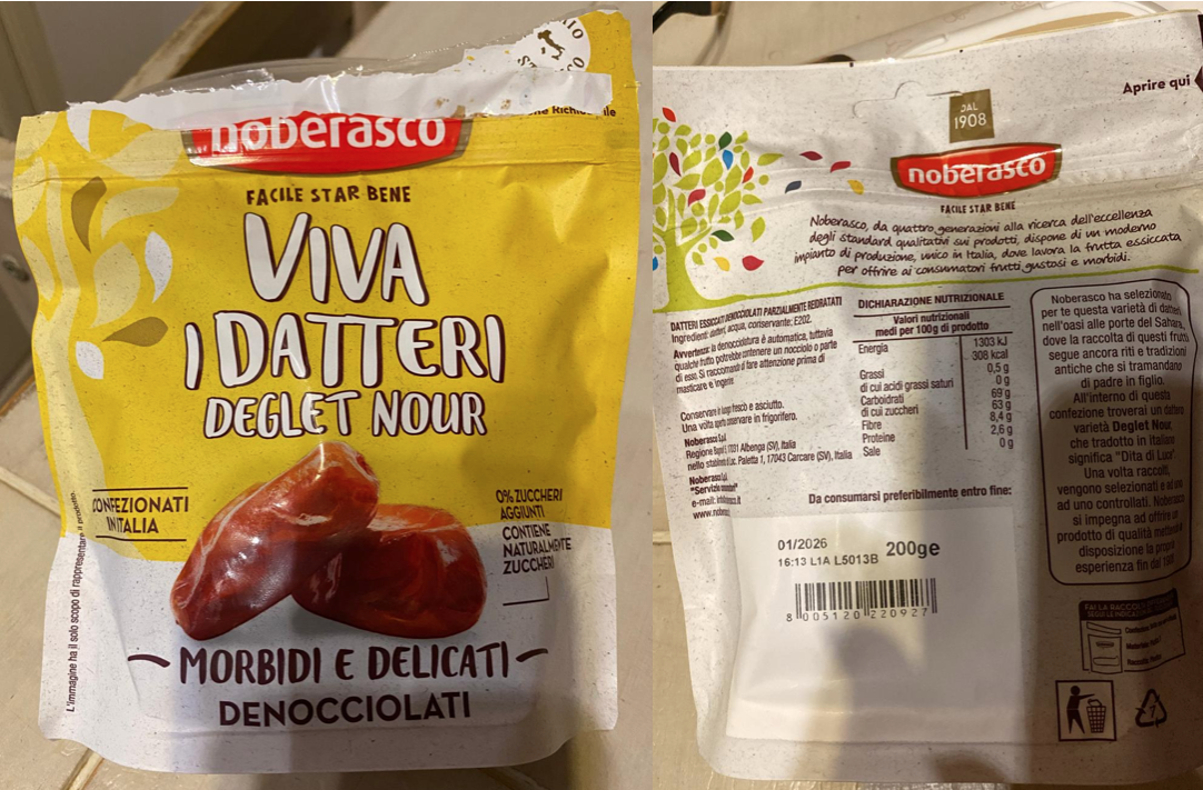 ho recentemente acquistato una confezione di Viva i Datteri Deglet Nour Noberasco e mi sono accorta che non c’è da nessuna parte l’indicazione dell’origine dei datteri. Ho controllato tutta la confezione, ma l’unica indicazione presente è “alle porte del Sahara”… Non è obbligatorio scrivere l’origine? In altri supermercati ho notato che l’origine viene quasi sempre riportata.