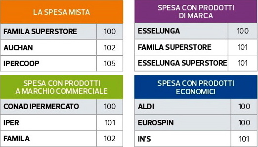 A guidare la classifica di supermercato più conveniente per la spesa mista, cioè quella composta sia da prodotti di grandi aziende sia da quelli con il marchio del supermercato, è Famila Superstore, seguito da Auchan e Coop. Esselunga è la catena vincente nella classifica di quelli che offrono i prodotti di marca a prezzi più convenienti, seguita a pochissima distanza da Famila Superstore e Esselunga Superstore, mentre Conad Ipermercato si distingue per essere la catena dove si spende meno per i prodotti a marchio di insegna. Per quanto riguarda i discount, Aldi e Eurospin si aggiudicano il primato per la convenienza, seguiti da In’s. L’indice 100 indica la catena più conveniente: se l’indice è 110, per esempio, significa che i prezzi sono del 10% più cari rispetto all’insegna più economica.