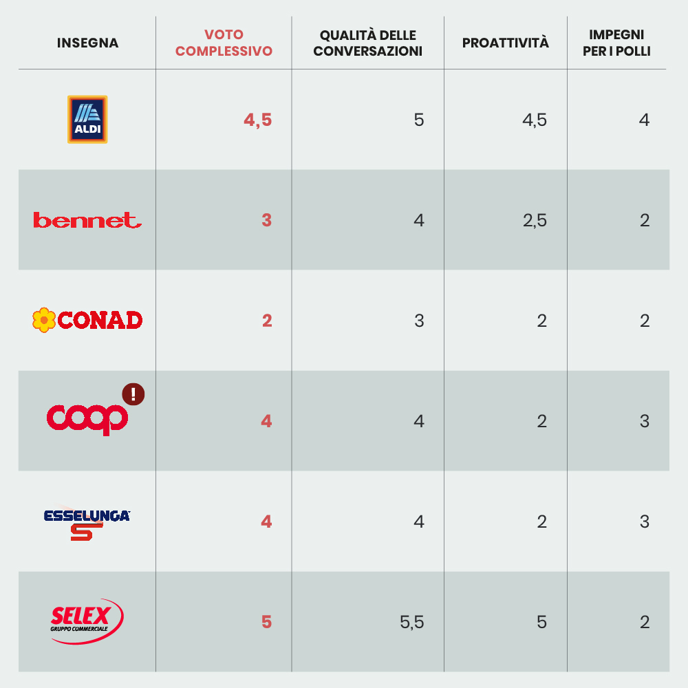 Il risultato è deprimente. Nella pagella conclusiva (vedi tabella sotto) nessuna catena raggiunge la sufficienza in una scala che va da 1 a 10. Il voto massimo sulla questione degli impegni per migliorare il benessere dei polli è ‘4’ quando la media è ‘3’. Anche il voto assegnato relativo alla propensione della catena a esplorare proposte concrete di miglioramento e l’adozione di impegni nelle comunicazione sul benessere animale è ‘3’. In altri termini si può dire che i supermercati se ne fregano del problema dei polli e non hanno intenzioni di cambiare nel breve periodo.