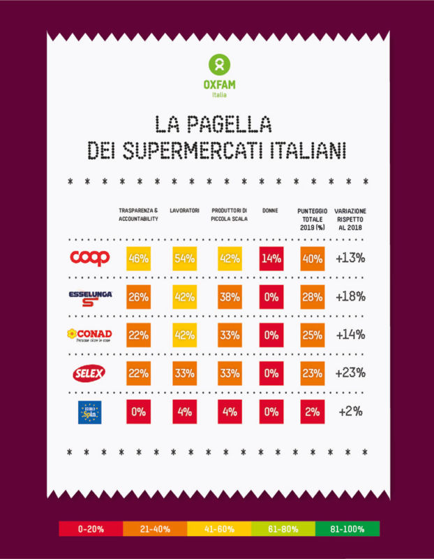 Il secondo rapporto Al Giusto Prezzo di Oxfam Italia propone la pagella aggiornata delle varie insegne, evidenziando alcuni importanti segnali di avanzamento sui quattro temi: trasparenza, diritti dei produttori di piccola scala, diritti dei lavoratori agricoli e diritti delle donne. Nonostante i miglioramenti di alcune catene nelle politiche per i diritti umani, molto resta ancora da fare, soprattutto per quanto riguarda le lavoratrici. I punteggi, espressi in percentuali, sono attribuiti sulla base delle informazioni pubbliche disponibili e sulla valutazione delle misure adottate per garantire il rispetto dei diritti umani e del lavoro.