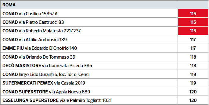 A Roma i punti vendita Conad sembrano dominare anche le altre posizioni della classifica. Al secondo posto infatti troviamo il Conad di via Attilio Ambrosini 189, con un indice di 117, a pari merito con Emme Più di via Edoardo D’Onofrio 140, mentre con un punteggio di 118 in terza posizione c’è il Conad di via Orlando de Tommaso 39 insieme al supermercato Decò Maxistore di via Camerata Picena 385. Scendendo dal podio, troviamo ancora un Conad, quello di largo Lido Duranti 5 in località Tor di Cenci, in quarta posizione con un indice di 119 insieme al punto vendita Supermercati Pewex di via Cassia 2019. In quinta, invece, c’è il Conad Superstore di via Appia Nuova 889 con un indice di 120, a pari merito con l’Esselunga Superstore di viale Palmiro Togliatti 1021.