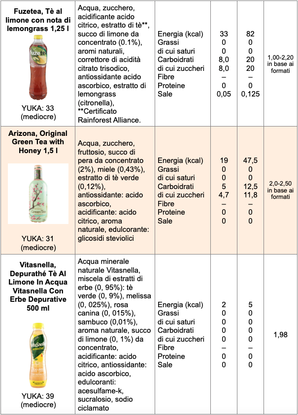 Le tipologie di tè freddo più gettonate sono al limone e alla pesca, ma si trovano anche bevande al tè verde, aromatizzate con mango, gelsomino o rosa, a base di tè deteinato, oppure senza zuccheri, dolcificate con edulcoranti, o infine ricavate da materia prima biologica. I formati variano dalle confezioni monodose da 200-250 ml, alle bottigliette da 400-500 ml, fino al formato famiglia da 1,5 litri. Abbiamo fatto un confronto fra alcune delle tipologie presenti sul mercato, considerando prevalentemente tè freddo al limone e tè verde, in formato da 1-1,5 litri.