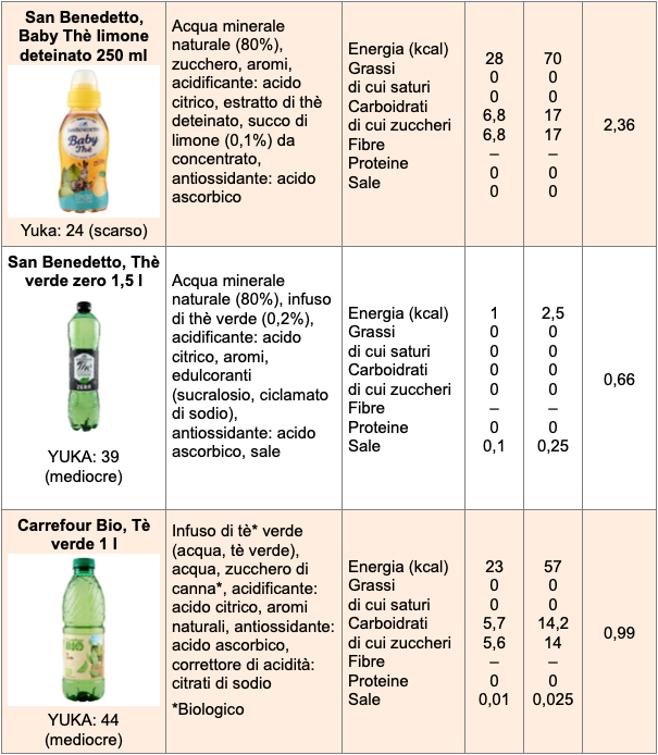 Per quanto riguarda la spesa, se consideriamo il prezzo al litro, questo è più conveniente per i formati di tè freddo più grandi e meno per i più piccoli. Per Estathè, per esempio, si possono spendere da 1,24 a 2,60 €/litro, mentre per le analoghe bevande a marchio Coop oppure Esselunga si spende la metà (fra 0,50 e 1,20). Si spendono 2 €/litro per il prodotto a marchio Vitasnella e 2,36 per il tè “baby” San Benedetto. In generale superano i 2 €/litro le versioni “green” aromatizzate con erbe o estratti vegetali: un prezzo che forse non vale la pena pagare.