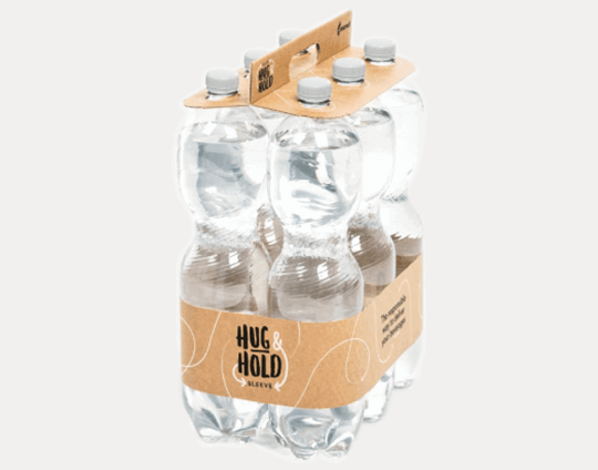 Un altro esempio è quello di Mondi, azienda multinazionale che ha messo a punto un dispositivo in fibre di cellulosa per trasportare le bottiglie più grandi chiamato Hug&Hold, composto da due parti. La prima è una fascia che avvolge la parte mediana delle bottiglie, tenendole ferme. La seconda è un cartone che tiene fermi i tappi, separa le bottiglie le une dalle altre e presenta una maniglia per il trasporto.