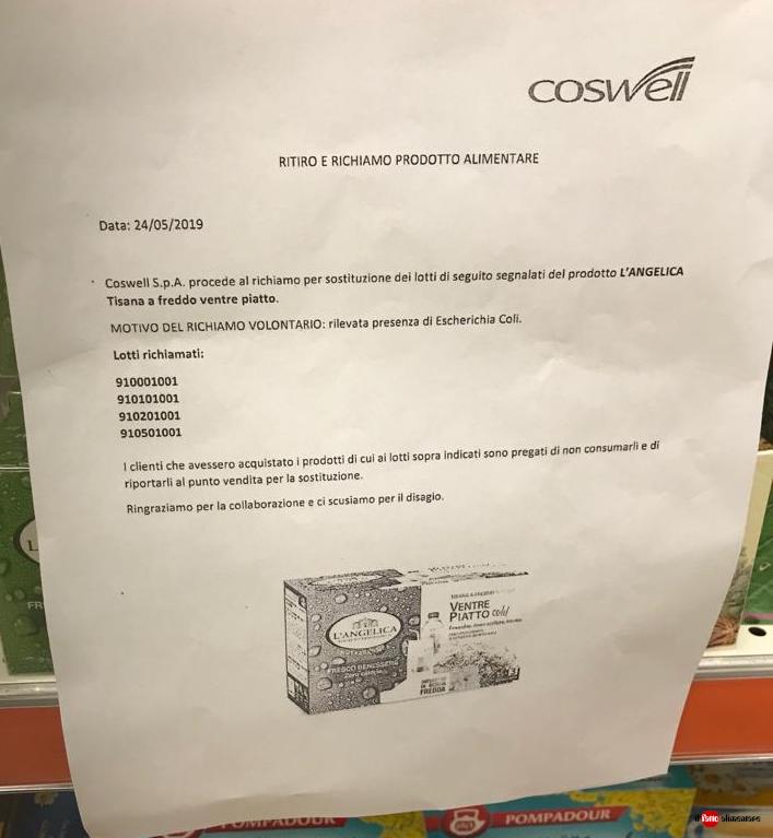 Il gruppo Coswell ha richiamato volontariamente quattro lotti della tisana Ventre piatto cold de L’Angelica per la presenza di Escherichia coli. La segnalazione del richiamo ci è arrivata da parte di un lettore che lo ha trovato questa mattina sullo scaffale delle tisane dell’Iper di Seriate (Bg) (vedi fotografia sotto). L’avviso è stato diffuso anche da Coop, Gros Cidac e Decò.