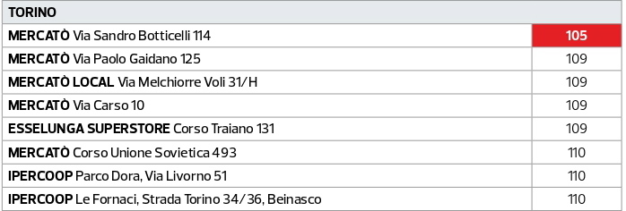 Al secondo posto, con quattro punti percentuali di distanza, troviamo appaiati tre Mercatò (via P. Gaidano, via M. Voli e via Carso) e Esselunga Superstore di Corso Traiano. Salgono invece sul terzo gradino del podio, con un ulteriore distacco di un punto dalla prima posizione, due Ipercoop (via Livorno e al certro commerciale “Le Fornaci”) e, ancora una volta, Mercatò (Corso Unione Sovietica).