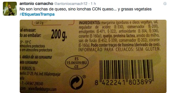 Anche il nome del prodotto e la foto che lo accompagna possono ingannare il consumatore. Sugli scaffali dei supermercati spagnoli si trova un prodotto precotto, chiamato “anillas a la romana”, che nella foto mostra dei calamari impanati. Nelle informazioni sugli ingredienti, si scopre, che si tratta di “prodotto trasformato della pesca”, in cui i calamari possono anche essere totalmente assenti. Nei primi quattro giorni della campagna su Twitter, con l’hashtag #EtiquetasTrampa, i tweet sono stati più di cinquecento e hanno raggiunto oltre un milione di persone.