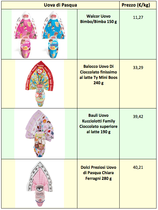 Le uova destinate ai bambini, prodotte da aziende come Balocco, Bauli, Dolfin e Walcor, costano in media intorno ai 35 €/kg, ma è difficile generalizzare perché le offerte sono tante e ogni catena propone qualche marchio a prezzi particolarmente convenienti. Quindi nei punti vendita possiamo trovare facilmente uova da 20-25 €/kg, cosa più difficile se facciamo acquisti online. Un volantino della catena Despar propone addirittura uova da 150 g a marchio Walcor a 1,69 €, quindi poco più di 11 €/kg. Le più amate dai bambini sono però probabilmente le uova Kinder Gransorpresa, firmate Ferrero, con la nota struttura a due strati latte/cioccolato. Il cacao, in questi prodotti, si ferma al 14,5%, tuttavia piacciono molto, sia per la dolcezza della materia prima, che i bambini conoscono bene grazie alle barrette e agli ovetti con lo stesso marchio, che per le sorprese particolarmente “ricche”, in sintonia con i loro desideri. Si parte da 60 €/kg, più o meno, ma possono arrivare anche a 80.