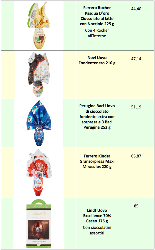 Le case produttrici di cioccolatini e tavolette in cui il cacao ha un peso maggiore, come Novi, Perugina o Lindt, puntano sulla qualità della materia prima e sui consumatori “affezionati”, proponendo uova a base di cioccolato fondente, anche con percentuali più elevate del minimo (45%), oppure al latte. Perugina ha una linea per adulti, con sorprese realizzate dai Maestri orafi veneti. Il prezzo medio di questi prodotti rimane attorno ai 45 €/kg, la variabilità però è notevole. Una nuova tendenza, pensata per gli amanti dei cioccolatini, è la proposta di uova di cioccolato, fondente o al latte, che, oltre alla sorpresa, contengono alcuni cioccolatini. Così per esempio troviamo l’uovo Ferrero Rocher Pasqua D’oro, con quattro Rocher all’interno, un Ferrero Collection, con tre cioccolatini diversi. L’uovo Perugina Baci, oltre alla sorpresa contiene gli omonimi cioccolatini, mentre dentro all’uovo Lindt Lindor troviamo le note “boules” con ripieno cremoso. I prezzi che abbiamo visto sono intorno ai 45-50 €/kg, anche in questo settore di mercato però le offerte sono numerose. Ha un prezzo diverso l’uovo Lindt Excellence con il 70% di cacao, contenente cioccolatini assortiti e venduto online intorno agli 85 €/kg.