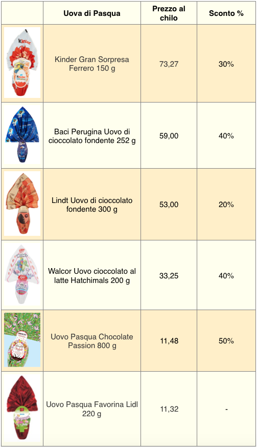 Quest’anno il prezzo medio delle uova di Pasqua di marca è di 25 €/kg, ma gli sconti sono all’ordine del giorno. Esselunga nello spazio di un weekend ha abbassato da 73 a 52 €/kg il prezzo dell’uovo Kinder Gran Sorpresa, mentre Coop lo mantiene ancora a prezzo pieno di 73. Scorrendo gli scaffali dei supermercati si trovano però decine di marche e formati (Bauli, Perugina, Lindt, Walcor, Trudi, Nestlé, Balocco, Maina…) in grado di soddisfare tutte le esigenze e tutte le tasche. Il budget da preventivare per un uovo da 150-200 g varia da 2,5 a 11 euro.