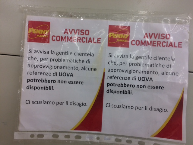 Al Penny Market di via Vallazze, il 30 ottobre verso le sette di sera, le uova ci sono (vedi sopra) ma un cartello avvisa i clienti che alcune referenze “potrebbero non essere disponibili” (vedi foto sotto).
