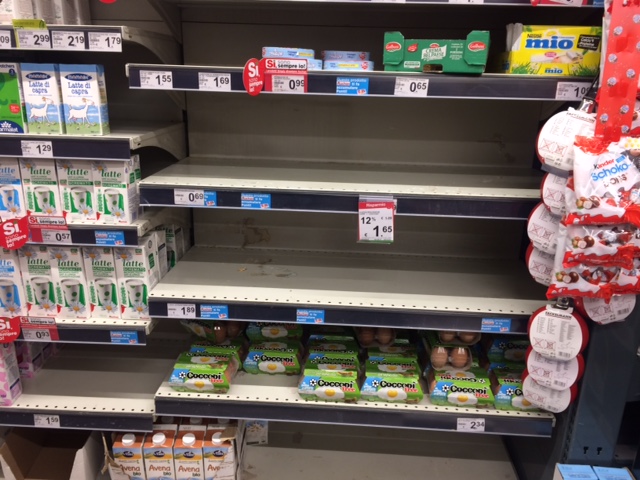 Sopra lo scaffale del supermercato Esselunga di via Feltre a Milano verso le 9 del mattino del 27 ottobre presenta diversi spazi vuoti