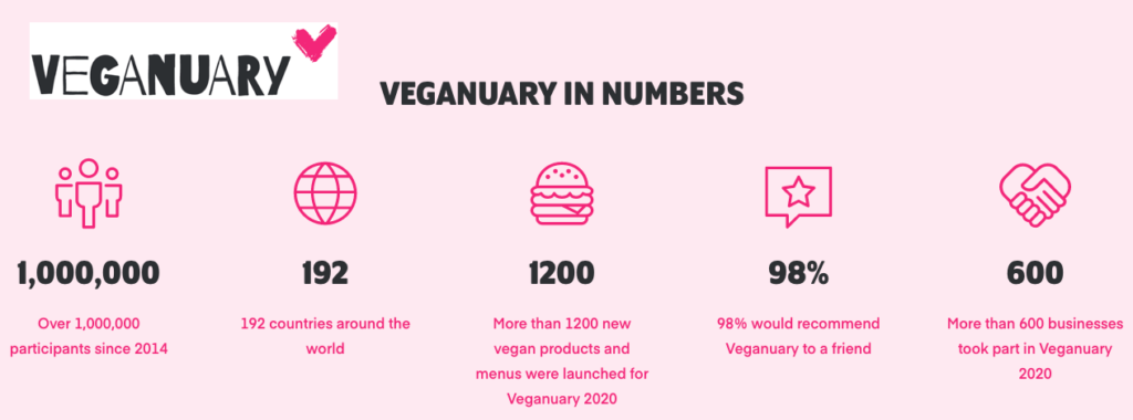 Oltre al colosso elvetico hanno aderito, tra gli altri, anche la catena di supermercati Marks & Spencer, i cui vertici hanno dichiarato di avere in programma un’espansione delle linee vegetariane e vegane Plant Kitchen, e di voler accompagnare la campagna pro-vegan con iniziative a uso interno, per i dipendenti, quali video, giochi e confronti tra i prodotti con carne e i corrispondenti prodotti vegetali. Inoltre hanno aderito anche grandi media come Bloomberg e, ovviamente, il primo produttore inglese di prodotti per vegani Quorn, il cui direttore esecutivo ha affermato che attraverso il Veganuary lo scopo è avvicinarsi all’obbiettivo di servire 8 miliardi di piatti vegani in tutto il mondo entro il 2030. Venerdì, primo giorno dell’anno e del mese vegetariano, inoltre, molte catene quali Domino Pizza hanno proposto soprattutto se non esclusivamente prodotti senza carne e sostituti quali i nuggets vegani, mentre altri hanno annunciato il lancio di nuovi alimenti come i bastoncini di finto pesce, a base di soia bianca di Moving Mountains, progettati con una consistenza fioccosa che dovrebbe riprodurre quella dei bastoncini di pesce vero. Si stima che nel 2020 siano stati proposti, nei paesi aderenti, oltre mille tra menu e nuovi prodotti vegetali.