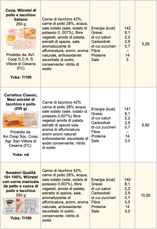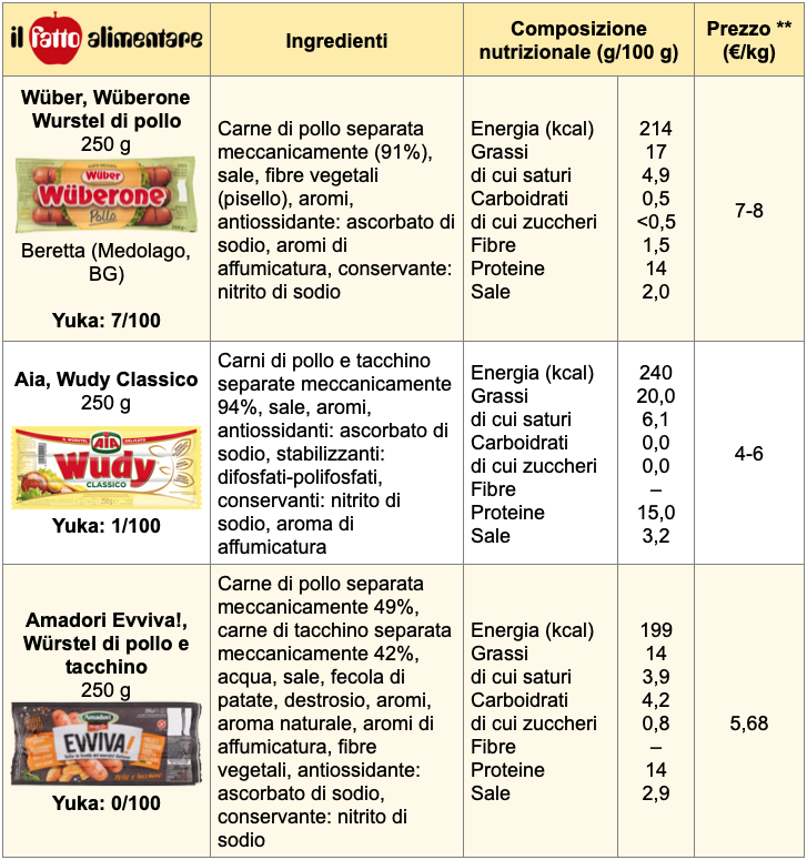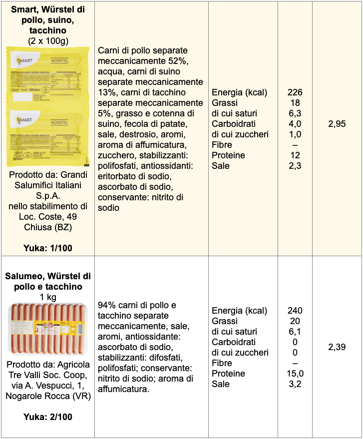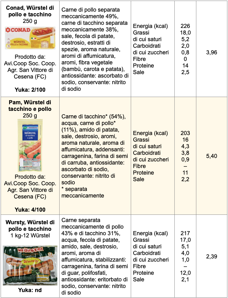 I prodotti più grassi sono quelli a base di carne separata meccanicamente, perché quando le carcasse di pollo e tacchino vengono spremute la pelle e il grasso sottocutaneo si mescolano e formano un composto uniforme. Bisogna poi notare che i würstel ricavati da carne separata contengono circa 2-3 g di sale per 100 g e quindi si tratta di prodotti troppo salati. Tenendo conto di questi aspetti e della presenza di diversi additivi, la valutazione dell’app Yuka è sempre scarsa. I prezzi sono molto diversificati e variano da 2,4 a 10,5 €/kg. In generale sono correlati alla qualità della materia prima, infatti i prodotti a base di carne separata meccanicamente sono i più economici.
