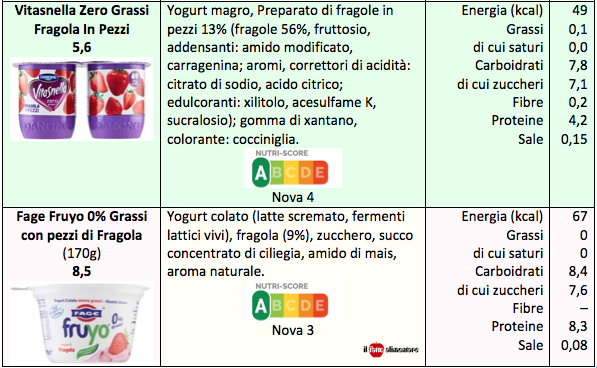 Tra i vasetti senza grassi quello che risulta più equilibrato è Fruyò, yogurt greco arricchito con preparato alla frutta. Le calorie per 100 g sono circa 70, gli zuccheri scendono a circa 8 g mentre le proteine, che in tutti gli altri vasetti sono circa il 3%, in questo caso arrivano all’8%. L’etichetta a semaforo Nutri-Score attribuisce a Vitasnella e Fruyò la lettera “A”. C’è però una differenza tra i due. Vitasnella rientra nel gruppo Nova 4 essendo considerato un alimento ultra processato, mentre Fruyò si colloca nel gruppo 3, perché contiene meno additivi, ma è presente amido di mais, per aumentare la compattezza.