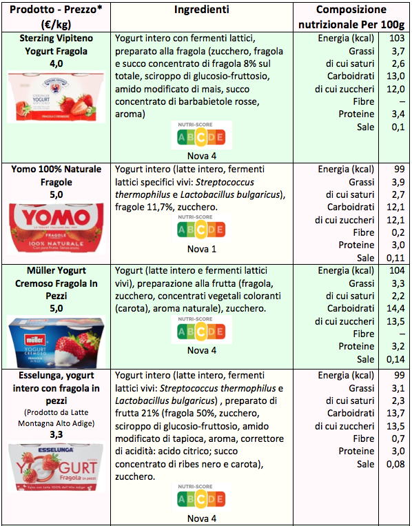 Nella maggior parte dei vasetti, lo yogurt (intero o scremato) contiene una preparazione a base di fragole, zucchero, sciroppo di glucosio-fruttosio – oppure dolcificanti artificiali – e aromi. La frutta può essere in pezzi, oppure in purea. Spesso, per dare una consistenza compatta, sono presenti addensanti come pectina, farina di semi di carrube o amido modificato, mentre succhi di barbabietole rosse, carota o ribes sono utilizzati per migliorare il colore. Nessuno dei prodotti analizzati contiene conservanti, che però si possono trovare in alcuni yogurt alla frutta.