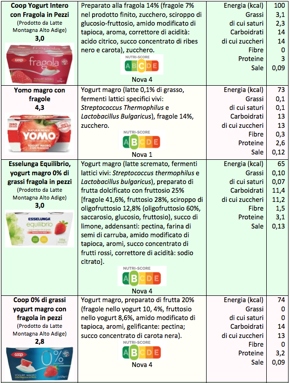 100 g di yogurt magro alla fragola a marchio Coop, Esselunga e Yomo forniscono circa 70 kcal, i grassi sono praticamente assenti mentre gli zuccheri sono in linea con gli yogurt da latte intero: 11-13 g. Grazie al basso contenuto di grassi la valutazione Nutri-Score è una B.