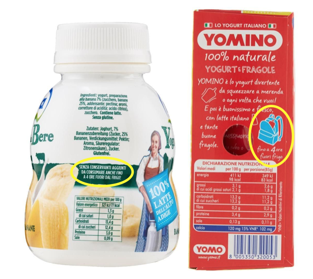 È quindi possibile portare uno yogurt a scuola come merenda oppure come spuntino durante una gita all’aperto senza bisogno di una borsa frigo o un contenitore refrigerato e, allo stesso tempo, senza che il prodotto perda tutte le sue proprietà benefiche. Per questo motivo, è molto più probabile trovare l’indicazione dei tempi di conservazione fuori dal frigorifero sulle confezioni degli yogurt da bere, per esempio su quello a marchio Mila (clicca sulla foto sopra per leggere l’etichetta), e in particolare quelli pensati specificatamente per i bambini, come lo Yomino o il nuovo yogurt da bere Meran, che assicura di poter essere mantenuto fuori frigo per ben otto ore.