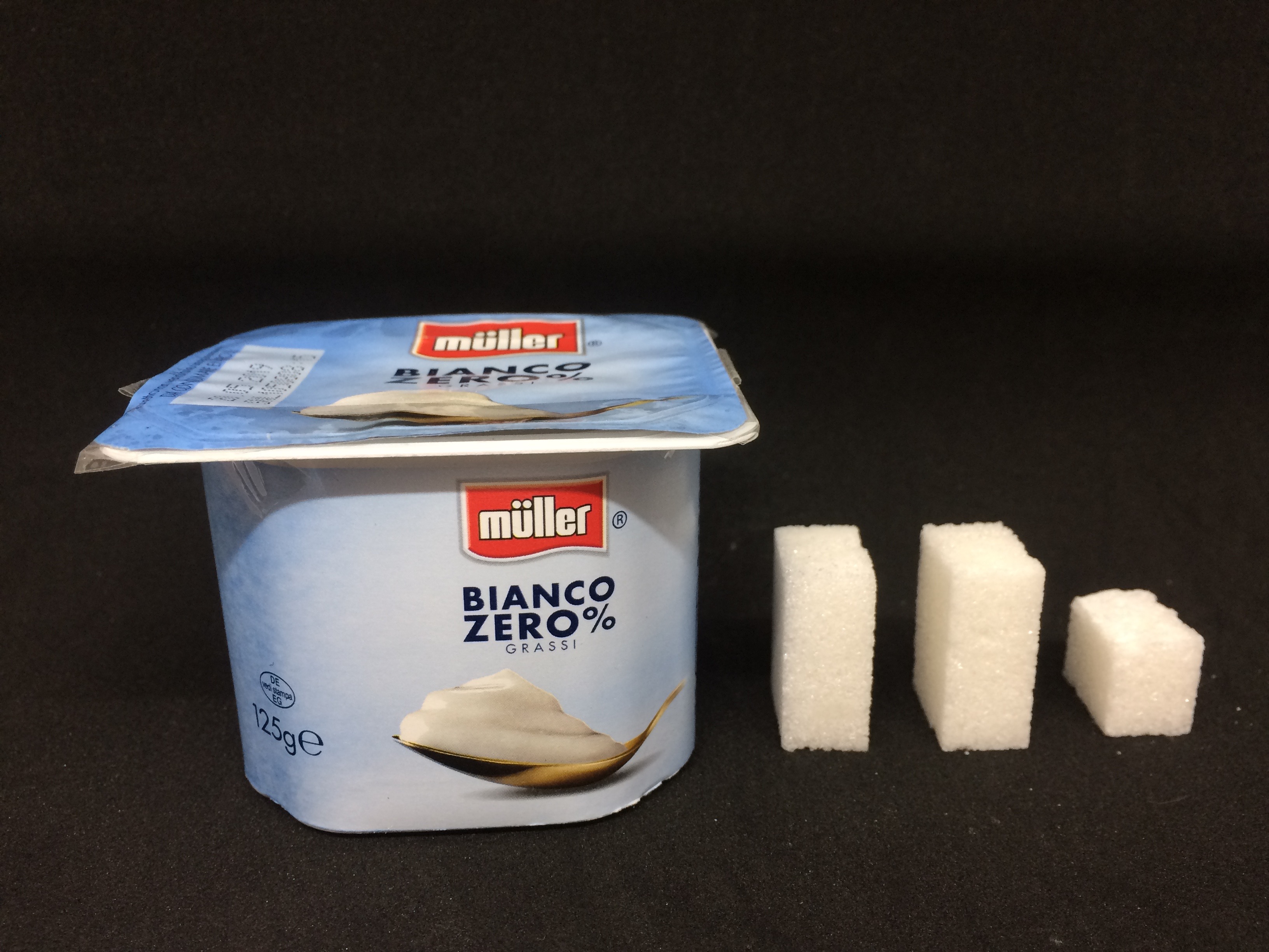 Quando compri lo yogurt “Muller bianco zero% grassi” da 125 grami hai la sensazione di acquistare un prodotto buono cremoso ma con meno calorie rispetto agli altri. In realtà non è proprio così perché il richiamo ai grassi può trarre in inganno. Le calorie contenute nel vasetto sono pressoché identiche a quelle di uno yogurt bianco intero: 67 contro 73! Questo perché al posto dei grassi, sono subentrate più proteine e sono raddoppiati gli zuccheri. Ogni vasetto contiene più di 13 grammi di zucchero pari a quasi 2,5 zollette da 5 g come si vede nella foto.