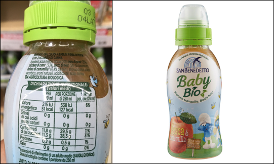 Il settore delle bibite dolci comprende molti prodotti destinati ai bambini. La bevanda Baby Bio di San Benedetto: proposta in bottiglietta da 250ml con tappo “squeeze” per facilitare l’uso, è pensata per i più piccoli, ma desta qualche perplessità. Una bottiglia di Baby Bio alla pesca e camomilla (1), contiene 28g di zucchero, un po’ troppo per la tranquillità delle mamme, invocata dallo slogan riportato sull’etichetta: “Mamme tranquille, bimbi felici”.