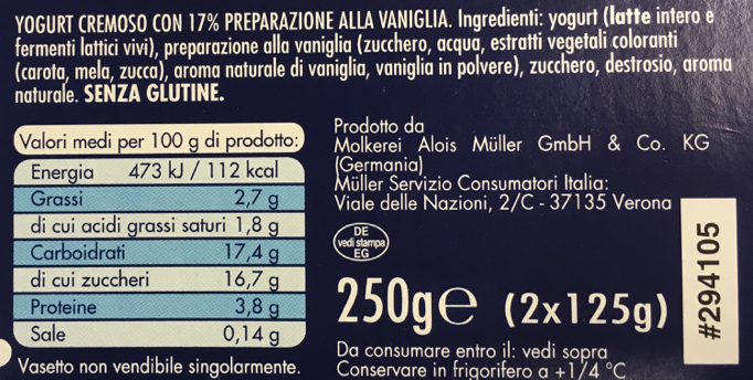 (2) Ingredienti Müller: Yogurt (latte intero e fermenti lattici vivi), Preparazione alla vaniglia (zucchero, acqua, estratti vegetali coloranti (carota, mela, zucca), aroma naturale di vaniglia, vaniglia in polvere), Zucchero, Destrosio, Aroma naturale